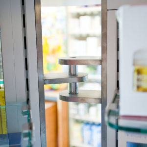 Arredamento di farmacia personalizzato con isole centrali in struttura di legno nobilitato finitura bianco, modulo attrezzato con cremagliere orizzontali, ripiani in vetro trasparente spostabili in altezza. Schienali in vetro trasparente, zoccolo, fianchi, top e ripiani in vetro della stessa tonalità , sagomati per ottimizzare il design e la qualità .